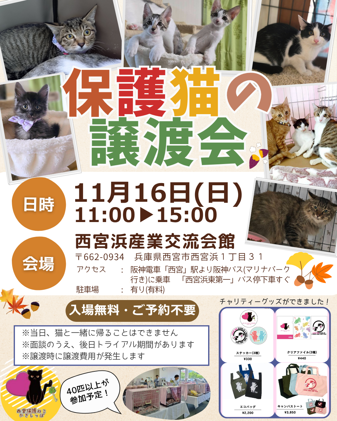今回もたくさんいる子猫たちを中心に、成猫さんやシニア猫さんもあわせて約40匹ほど参加予定です。