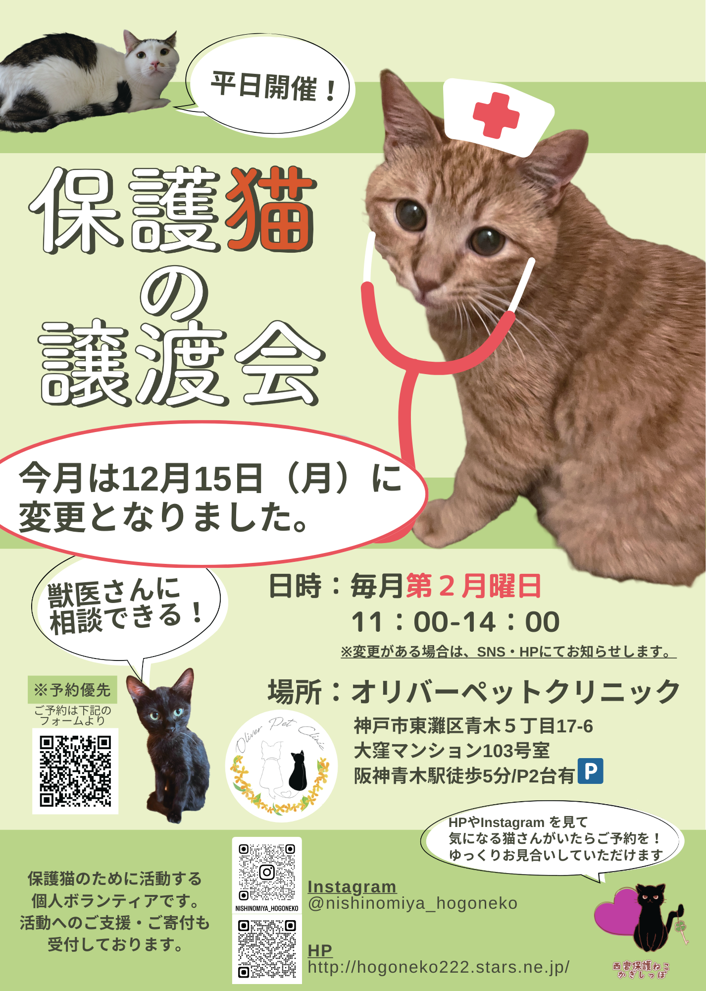 毎月第2月曜日のオリバーペットクリニック様でのミニ譲渡会は、日程変更となり12/15(月)に開催となります。