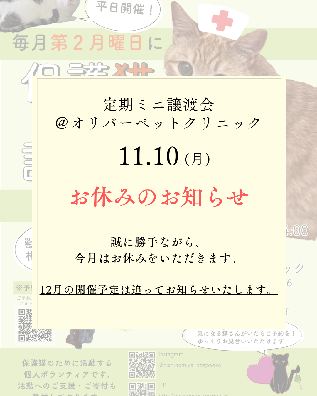 毎月第二月曜日に開催しているミニ譲渡会(会場オリバーペットクリニック様)ですが、